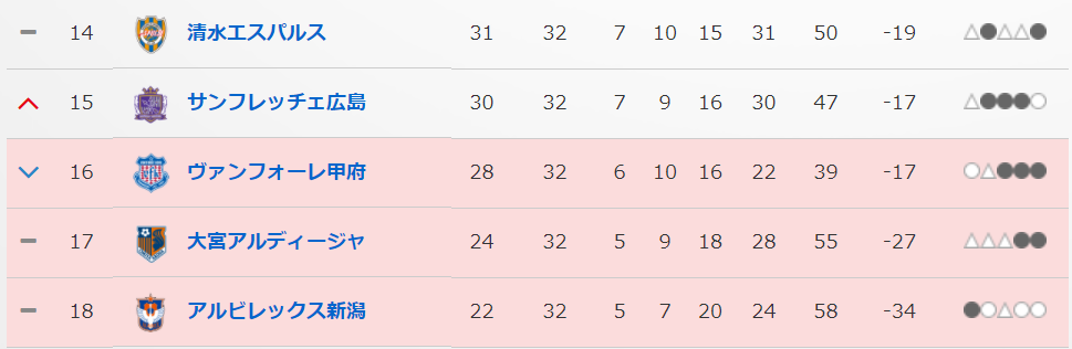 第32節で北海道コンサドーレ札幌のJ1残留、アルビレックス新潟のJ2降格が確定しました。