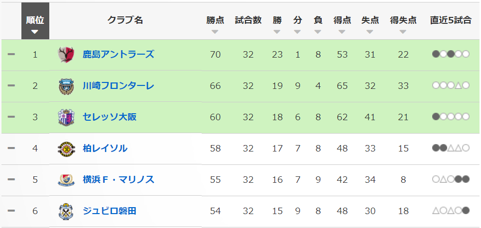 鹿島の2位以上、川崎の3位以上が確定しているため、残り1枠の争いとなっています。