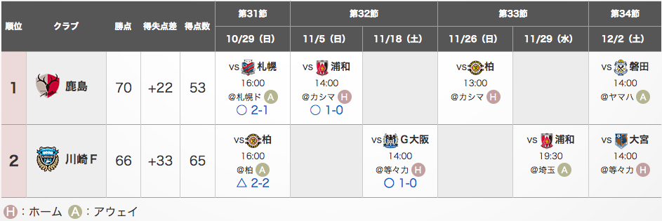 なお、第33節で鹿島が△の場合は川崎Fが○、鹿島が●の場合は川崎Fが〇か△で、最終節までもつれ込みます。
