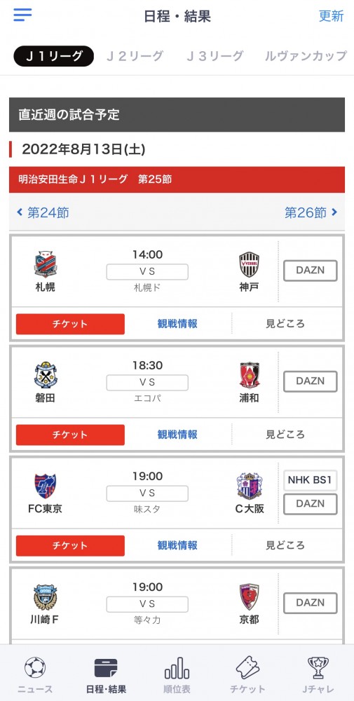 「日程・結果」では大会・節ごとに日程・結果をチェックできます。