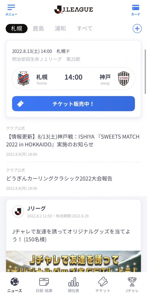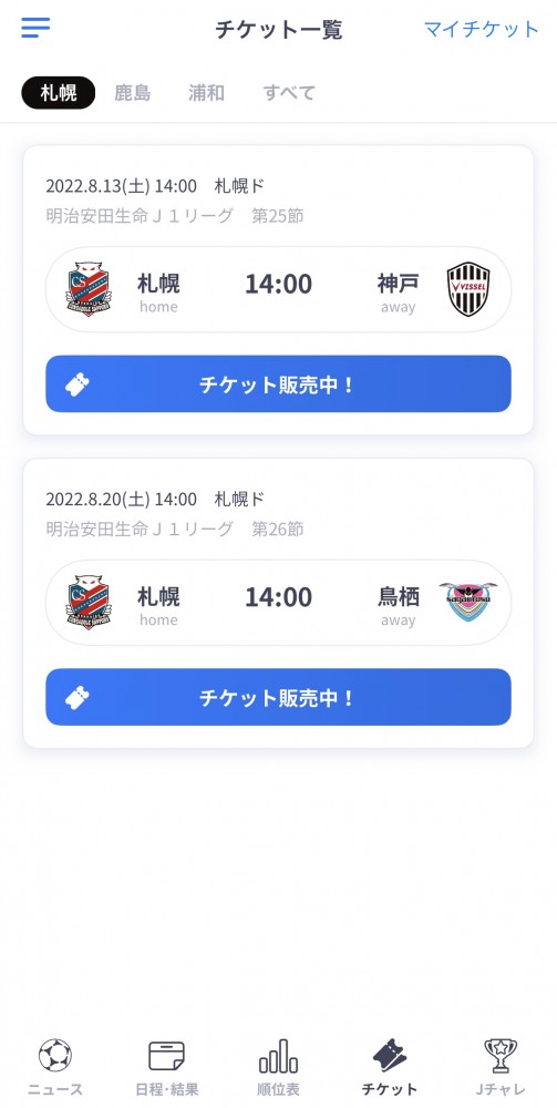 「チケット」のメニューをタップすると、お気に入りクラブの直近の試合が表示されます!