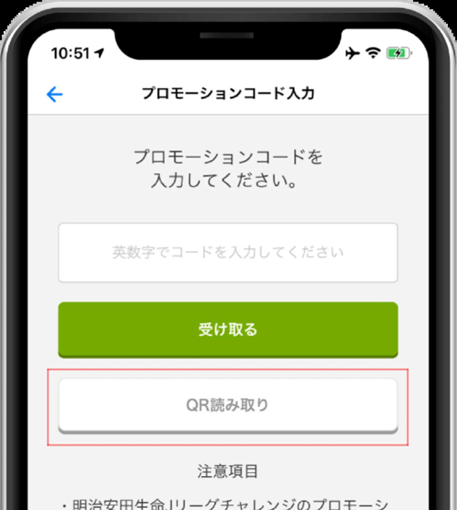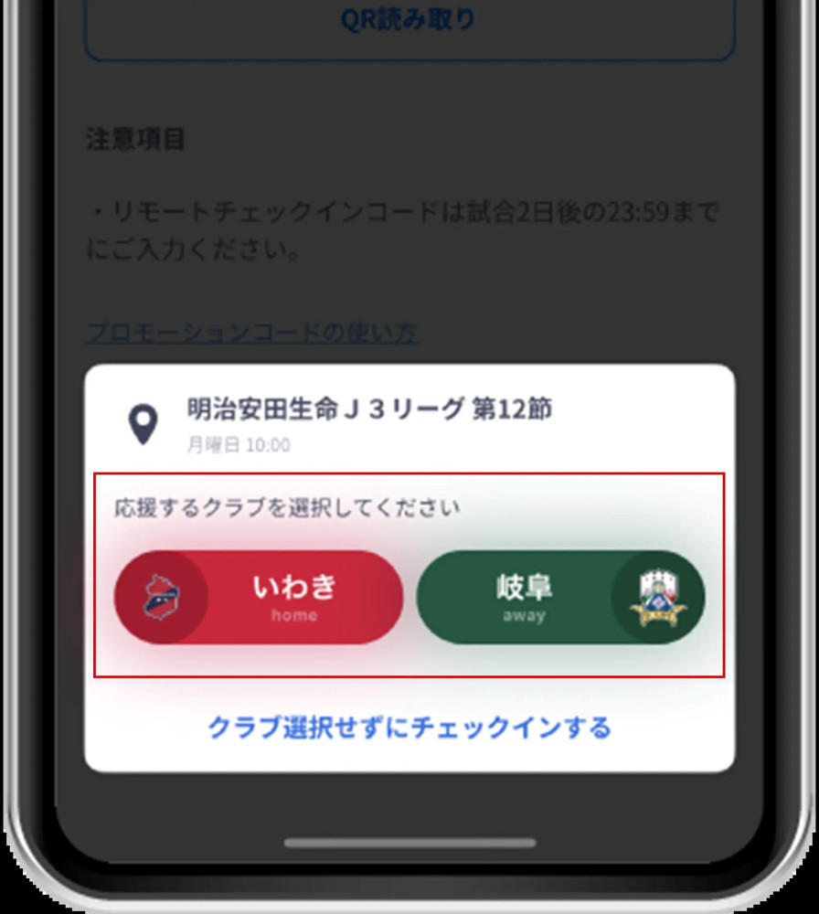 ②ハーフタイム、試合終了後に表示されるQRコードを「QR読み取り」を押して読み取るか、プロモーションコードを直接入力する。