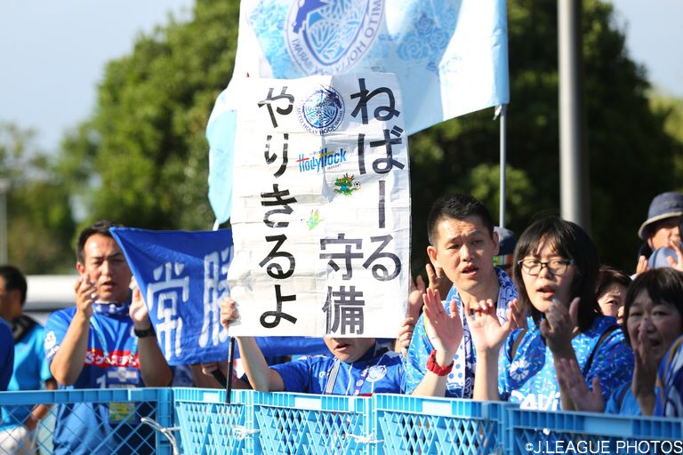 水戸ホーリーホックサポーターのゲーフラには、「ねばーる」の文字が。