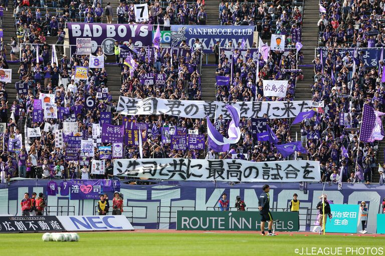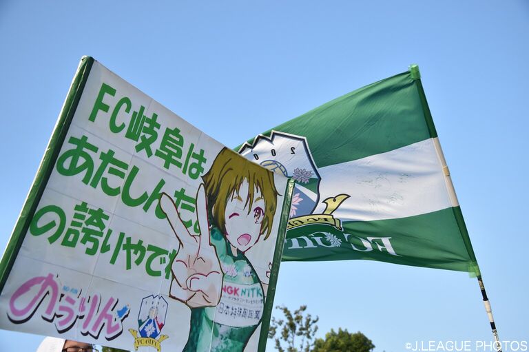 アニメとのコラボを多く実施する水戸ホーリーホック、FC岐阜のゴール裏にはアニメデザインのゲーフラがたくさん掲げられます!