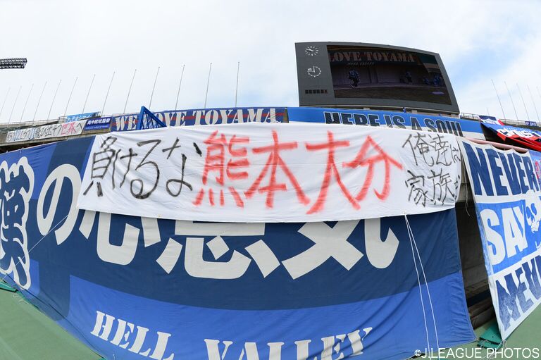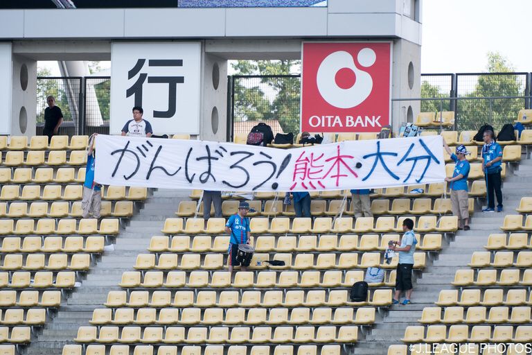 熊本県を拠点とするロアッソ熊本、大分県に所在する大分トリニータのサポーターは激励メッセージを受けて弾幕で返答しています。