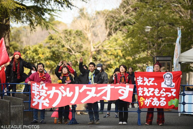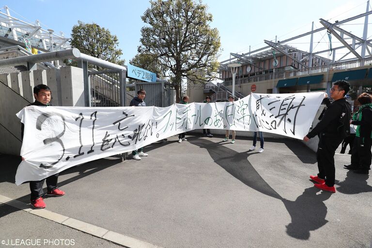 同じく3月11日にニッパツ三ツ沢球技場にて開催されたY.S.C.C.横浜と福島ユナイテッドFCの試合では両チームで作った横断幕が掲げられました。