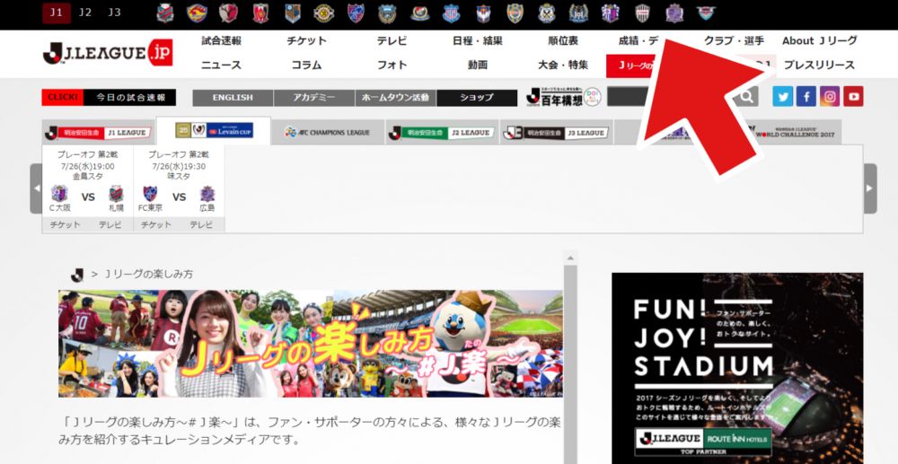 各クラブの公式サイトにはJリーグ公式サイトのページ上部にあるエンブレムから飛ぶことができますよ!