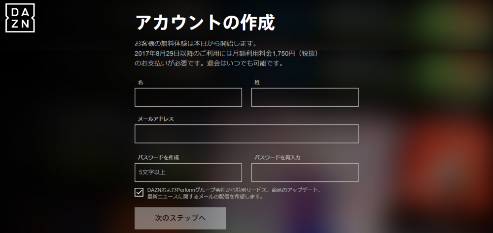 名前とメールアドレス、パスワードを記入し「次のステップへ」をクリック。