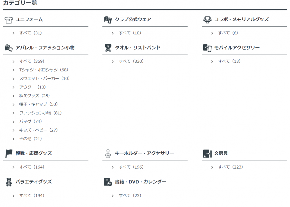 クラブに関係なくカテゴリごとでもグッズを探す事ができます。