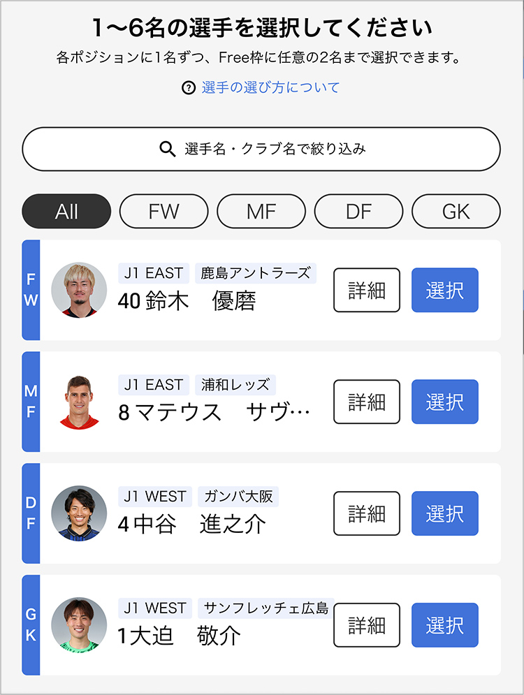 | ポジション枠 | GK、DF、MF、FWから各1名 |