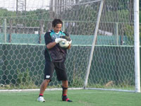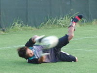 ゆっくりの数周のランニングの後、今度はグローブをはめ、ゴールマウスを背に構えます。スタッフに協力を仰ぎ、地に足をつけたまま取れる範囲内にボールを蹴ってもらい、キャッチングの練習です。まだ、ジャンプができないため、蹴るスタッフもより一層のコントロールを求められるだけに一苦労です。厳しいボールが飛ぶ度に、「ヒドイ!けが人をいじめるんだ〜」と、土肥選手からツッコミが入る始末。思わず「大変っす…」と、スタッフから弱音(?)が聞かれました(笑)。そして、最後は倒れ込んでのセービング練習。とてもケガ人とは思えない鋭い反応で、20球ほどを全て捕球していました。