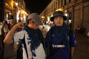 今回、日本から来るG大阪のサポーターはツアー参加者が25名程度で、個人で来るのは「多分、この2人だけだと思う」とのこと。2人が首に巻いていた現地の青黒のスカーフは、スークの一番奥まで探して見つけたもので、「青黒のものがなくてやっと見つけました。結び方はお店の人に教えてもらいました」。オフィシャルグッズかと思うくらい、違和感なくガンバカラーのスカーフ。アラブではあまり見ない配色なのに見つけ出すとは、さすがサポーター!と感心する。スタジアムでの再会を願い、2人と別れウマイヤド・モスクに戻る。門は開き、イスラム教徒がモスクに入って行くが、異教徒の入口である北門は閉められ、モスクの中に入ることはできなかった。