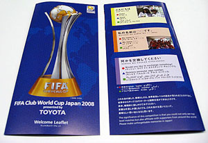 「TOYOTAプレゼンツ FIFAクラブワールドカップ ジャパン 2008」の試合会場にて、本大会初の試みとして、来場者全員に、入場ゲートにてウェルカムリーフレットが配布されます。本大会の魅力は、FIFA主催の国際大会であり、世界トップレベルの試合が見られることだけでなく、日本にいながらにして世界各国からやってくるサポーターたちと交流が図れるところです。本リーフレットは、来場者が世界各国から訪れるサポーターと少しでも言葉を交わすことにより、コミュニケーションが図れ、サッカーを通じた国際交流及び本大会が互いにとって素晴らしい思い出となることを目的として実施致します。試合会場における交流は、実際に試合会場へ訪れた人にしか味わえない魅力でもあり、このような施策を実施していくことで、この大会を試合会場で楽しんでもらえる人をひとりでも増やしたいと思っております。実施概要は下記の通りです。