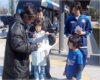 ホームゲームの来場を呼び掛けるキャンペーンがライトレール富山駅北の電停であり、選手も参加してファンとふれあった=3月1日