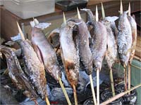 そして番外編は「イワナの塩焼き」(500円)。いかにも職人、俺は魚を釣っているだけだと体で主張しているようなご主人(笹六総本舗)の鋭い視線を感じて、「これ、ください」。正解でした。川魚特有の淡白な白身が炭火に焼かれてふんわりと焼き上がった一品。骨はもちろん、尻尾の先から頭の先まで余すところなく食べられる。塩がこれでもかと掛かっているにもかかわらず、塩辛くなく、あとから喉も乾かない。さすがに塩にこだわっているというだけのことはある。魚好きには是非お勧めしたい。