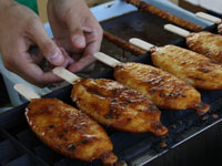 その串焼きの旨さを十分に認めながらも、それでも私が一番に推したいのは「五平餅」(200円)。炊いた米を6〜7分程度にすりつぶし、それを草履のような形にして割りばしに練りつけたものに、甘辛い味噌だれを塗って焼きあげたもので、素朴な味がうれしい。まずは素焼きにし、次に味噌だれの入った器の中にどっぷりとつけてから焼き上げる。白い五平餅に焦げ目が付き、味噌だれに包まれて茶色に変身し、その味噌だれが焦げて甘い香りを漂わす。食欲がわかないわけはない。売上は1試合で250本以上。リーズナブルな値段も含め、飛騨牛の串焼きに匹敵する人気を誇っている。