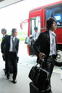 遠征に臨む市村篤司選手(右)、河端和哉選手ら選手達。ビシッと揃いのスーツを着込んだ“戦う集団”は、空港ロビーでも目立ちます。