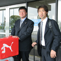 全ての遠征に帯同する吉本マネージャー(左)と主務の宮内さんも、練習場で見る時とはひと味違います。