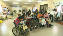 クリーニング会社で作業しているのは、重複障害者の人たち。母親や、地元の大学生のサポートを受けながらも、その目は働く喜びに満ちている。