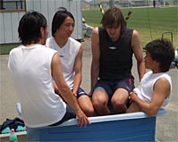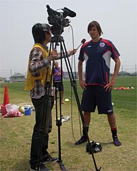 第19節(6/3 vs徳島)で、ホーム初お目見えとなる。もちろん、TV局も放っておくはずがない。照れながらインタビューを受けていたが、注目してほしいのはカメラの位置(写真1)。カメラマンの背の高さと比べてもらえれば、その高さもわかるであろう。この高さ、明日のベアスタで炸裂してくれるのか…乞うご期待!