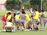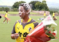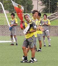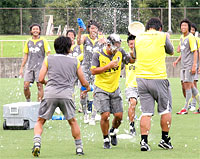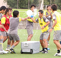 というのも、今日は北野誠監督の誕生日。当然、他クラブでも目にする“お祝いの儀式”が行われるはず。今日の取材の目的は、練習内容よりもこっちの方がメインと言っても過言ではなく、トレーニングの間はスタンドから見ていた地元紙のK記者とともに、練習メニューが一段落したと見るや、早速カメラを持ってピッチへ。