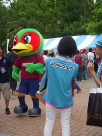 先着のサポーターが、岡山のキャラクター「ファジ丸」をカメラ付き携帯で撮影していました。