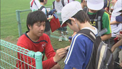 多くの子供からサインを求められ、快くサインを書くパク選手