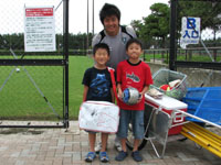 夏休みを利用して、お母さんと一緒にやってきた小野山雄稀くん(8歳)と、寿希くん(6歳)の兄弟。ボールとバックに選手全員のサインをもらいご満悦。最後は六反勇治選手と一緒に記念撮影。