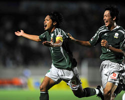 勢いに火がついた岐阜は、その後も猛攻を仕掛けると、80分、ついにクライマックスのときを迎えた。右CKを得ると、高木が放ったボールは相手DFのクリアに合うが、そのクリアボールはペナルティエリア外で待ち構えるMF菅和範の下へ、糸を引くように導かれていった。菅はじっくりと力をためて、ボールの落ち際をダイレクトで右足で叩くと、ドライブ回転したボールは、ゴール右隅に突き刺さった。
