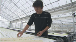山梨県韮崎市にある農業生産法人「ベジタブルラウンジ」。このベジタブルラウンジの「農業とフットサル」という新たな試みは、市のふるさと雇用再生特別基金事業として市の全面的な支援を受けている。ベジタブルラウンジでは、7千平方メートルの農地で水耕栽培を行い、6種類のレタスやルッコラなどを生産。これら野菜の種植え、発芽した苗のプランターへの移動など、ひとつひとつの作業を丁寧に笹垣は行う。農業は初めての経験で、手慣れない笹垣だが、野菜の成長が目で確認でき、楽しいと彼は言う。