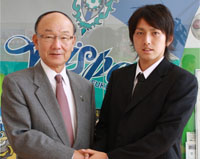 仮契約締結後、本社ロビーで都筑興代表取締役社長(左)との記念撮影に応じる宮路洋輔(右)。即戦力としてクラブが懸ける期待は大きい。