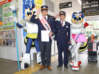香椎駅の1日駅長を務めた、アビスパ福岡・布部陽功アンバサダー。駅長姿が中々堂に入っている。