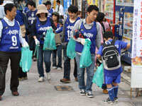 香椎から千早へ続く商店街と住宅街の清掃活動を行うサポーター、ボランティア、クラブ職員。商店街ではアビスパを応援する声もかけられていた。