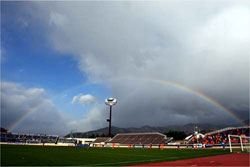 第3位には、アマチュアとして唯一勝ち残っていた明治大に3−1で貫禄の勝利を見せたアルビレックス新潟・矢野貴章選手の写真がランクイン。2ゴールの活躍でベスト8進出の原動力となりました。なお、試合が行われたNDスタジアムには、見事な虹もかかり、新潟の勝利を祝福しているようでした。
