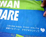 旗のデザインもクラブボランティアが主導した。「HEART&HARD」を掲げる湘南らしく、鮮やかな青と黄緑にハートがあしらわれており、軸に巻きつけると手元にもハートが浮かぶ。バックスタンドに現れる大きなハートと呼応するかのようだ。この旗をキックオフの1時間前を目安に配り始める。観客が多く入った試合では、10分あまりで「完配」したこともあるという。