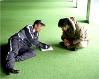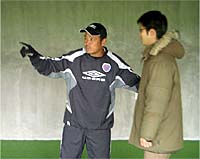 この熱いハートの持ち主である岸野監督が、この日はマスコミ陣に熱くサッカーを語ってくれた。発端は、練習後の囲み取材で、某社の記者が「FWがスペースを作る動きとは?」という質問をしたことだった。最初は、記者のノートに図を書いて説明し始めたのだが、徐々に熱が入り、記者を相手DFに見立てて、自らFWの動きを見せる熱の入れよう。延々と小1時間のサッカー講義と相成ってしまった。受講生となった某社の記者は、「よくサッカーがわかりました。これで次の試合から見る目が変わります」と高評価だった。