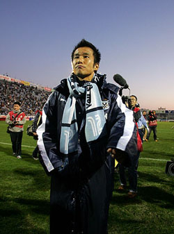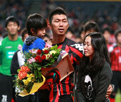 彼の場合は引退ではなく、チームを離れる選手。試合後、声援が送られるスタンドをじっと眺めている中山選手の表情は、言葉では言い表せないものが感じられる一枚となりました。