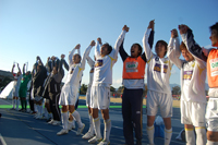 J2昇格内定となる4位以内を決め、喜ぶニューウェーブ北九州(現ギラヴァンツ北九州)の選手たち。来季はいよいよJ2の仲間入りだ。