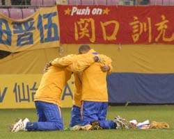 最後に紹介するのは、J2優勝を果たした仙台のブラジル人3選手エリゼウ、マルセロ・ソアレス、サーレスがピッチの中央部へ。そして皆で肩を組み、ひざまずいて、祈りを捧げ始めまている写真です。