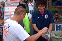 その活動には愛媛FC選手会も賛同し、回収BOXを寄贈しました。そして兼田亜季重選手もボランティアスタッフと一緒になって回収に参加した第39節・徳島戦では、1試合で4,800個を回収すると、地元のマスコミにも取り上げられたこともあってその後、活動は一斉に愛媛県下に広まりました。そして第42節・福岡戦では八幡浜高校の生徒会が10,000個のキャップをニンスタに持参。以後、県内各地の小・中・高校からエコキャップがニンスタに集まるようになり、累計30万個を突破したのです。(愛媛FC公式HP内エコキャップ運動)