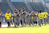写真撮影が終わると選手たちはトレーニングウェアに着替えて初練習がスタート。この日はまずジョギングとストレッチで身体をほぐし、腹筋等のあとでピッチ内の外側をランニングで10周。その後はスパイクに履き替え、4m四方程度のグリッドを設けて、オニ役が入れ替わりながらワンタッチの4対1、さらにストレッチを挟んでショートスプリント、もう一度4対1とこなしてクールダウン。柔らかい日差しの中、約1時間半と軽めに汗を流した。