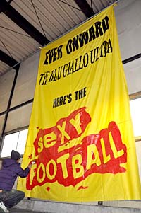 草津サポーターが2010シーズンのために制作した縦4メートル横11メートルの大型横断幕イタリア語で「黄色と紺のウルトラ」と意味する「BLU GLALLO ULTRA」という文字が書かれている