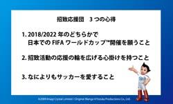 ●内容:2018/2022年ワールドカップ日本招致活動を応援いただき、「お名前(ニックネーム可、12文字以内)」と「日本開催を願う熱いメッセージ(20文字以内)」を寄せてくださった方に、オリジナル応援団カードをその場で5枚発行します。