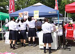 徳島戦当日、ブースの出店準備を行なう熊本商業高校の生徒さんたち