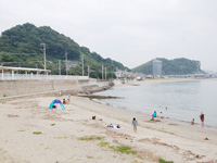 『愛フィールド梅津寺』の目の前に広がる梅津寺海岸。リハビリ中の選手がこの海岸でトレーニングをすることも。左側にある駅のホームがドラマの舞台となった梅津寺駅。