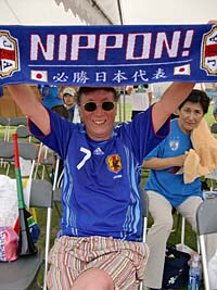 甲府サポーターもこの日は日本代表のレプリカで応援。数時間後には隣の小瀬で甲府のリーグ戦があるので試合後はアンブロ(甲府のレプリカユニフォーム)に着替える。後ろで代表のTシャツを着ているのは林健太郎氏の叔母様