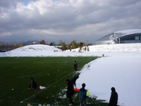 で、グラウンドに着いてみるとまあ、雪です。午前中はグラウンドの全面が雪に覆われていたようだが、スタッフさらには矢萩竹美社長らが除雪にあたり、半分くらいの面積が顔を出していた。あらためて、芝生の緑色の鮮やかさが感じられた。練習開始直前には報道陣も除雪作業に加わった。