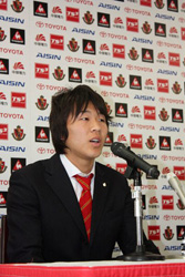 最後に田中輝希選手です。彼も1992年生まれで、ポジションはMF。東京の名門、三菱養和ジュニア、そしてユースで活躍しました。U-18の日本代表候補にもなっていまして、昨年の指宿でのキャンプにも参加してもらいました。非常に体格がよく、182?の長身で、スケールの大きなプレーヤーになってほしいと思っています。パスやドリブルなども能力が高く、将来のグランパスの攻撃の中心になってもらえると思っています。この3人、福岡大学と流通経済大学柏高、そして三菱養和。サッカー界の名門から育った選手をお預かりして、しっかり育てていこうと思っています」