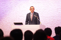 グループワークの後、それぞれのグループから代表者を1人決定し、総仕上げは全員集まる会場のステージ上で模擬インタビュー。試合後のヒーローインタビューをイメージし、プロのリポーターからインタビューを受けた。