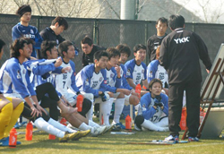 ハーフタイムに安間監督からの指示を聞く選手たち。計90分で行われたゲームは後半に2失点して昨季J1京都に0−2で敗れたが、「3-3-3-1」の守りはおおむね機能。指揮官は「静岡での1次キャンプの成果がでていた」と手ごたえを語った。